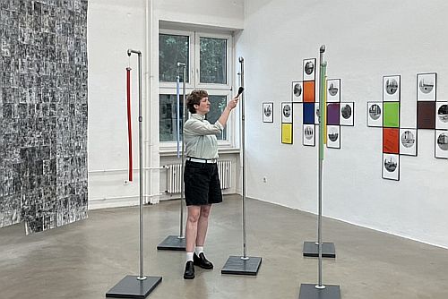 Den Abend in der Galerie eröffnet Elisa Metz. Vor rund fünf Jahren hat sie in der Glaserei ihres Onkels das Material für ihr Instrument „Glass Wands“ entdeckt. Unterschiedlich lange Glasstäbe in verschiedenen Farben bilden die Basis dieses begehbaren Klangkörpers, den sie gemeinsam mit Hanno Mühlenbach entwickelt hat. Bei der Performance schlägt sie die frei schwingenden Glasstäbe mit einem Hammer unterschiedlich stark an und entlockt ihnen Klänge im Obertonbereich, die sich nur minimal voneinander unterscheiden. Am Ende entsteht eine kleine Symphonie der hörbaren Stille.