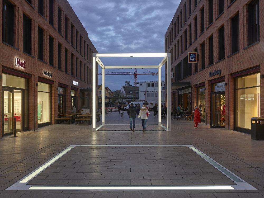Die zeitweilige und die dauerhafte Ausstellung von Skulpturen im Freien sind etwas Verschiedenes. Auf Dauer müssen die Werke nicht nur andere Anforderungen z.B. der Robustheit erfüllen, sondern sie dürfen mit der Zeit auch nicht auf die Nerven gehen, schließlich besteht das Publikum aus Anwohnern und Passanten. „Man muss es auf Dauer ertragen“, hat der Düsseldorfer Lichtkünstler Mischa Kuball bei der Vorstellung seines Beitrags für Monheim gesagt. Am dortigen Ingeborg-Friebe-Platz steht sein monumentales Raster aus Lichtleisten, das einen Kubus umschreibt. Bewegt man sich hier, ist mit dem Laufverhalten Sound zu hören. Zu „monheim_cube“ gehören drei zeichenhafte Lichtachsen an peripheren Orten. Nachts erleuchten sie die urbane Szenerie, und es ist phantastisch, wenn man es im richtigen Moment erlebt (Anm. d. Red.: bei Redaktionsschluss in Wartungsarbeiten).