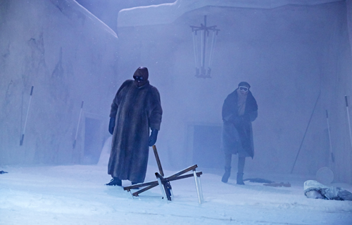Das soll also die Zukunft sein. Ein Bühnenbild wie aus einem Star Wars-Film. Ist Ijon Tichy etwa auf dem Eisplaneten Hoth gelandet, nachdem die Imperiale Flotte den Rebellenstützpunkt atomisiert hat? Oder ist das nur eine Halluzination? Zu Beginn der Inszenierung von Stanislaw Lems „Der futurologische Kongress“ im Theater Oberhausen sind jedenfalls nur verschneite Ruinen zu erkennen, ein Telefon, ein steckengebliebener Fahrstuhl – und die Eiswelt-Kostüme – es sieht so aus, als sei es tatsächlich scheißekalt. Also nix mit Luke Skywalker, hier ist Raumfahrer Ijon Tichy richtig, das ist wirklich das einst schicke Hilton-Hotel von Costricana, nachdem es von Aufständischen angegriffen und zerstört wurde – und die Zerstörungen sind wohl noch nicht beendet. Ein dystopischer Zustand, befinden wir uns doch in einer Zukunft, in der Halluzinogene den Menschen das Leben erträglich machen sollen. Doch wie soll Regisseur Thomas Schweigen das Unglaubliche plausibel machen? Das Schöne an diesem Abend ist, er versucht es erst gar nicht. Seine Geschichte von Tichy ist die permanente Suche hinter den Dingen, hinter der merkwürdigen Person am Hotel-Rezeptions-Telefon, hinter den Mitstreitern, hinter der Welt und den rissigen Mauern. Tichys geliebte Raumstation ist weit und die Regie tut alles, dass seine Verwirrung und die Suche nach Löchern in der Matrix (Bühnenbild: Stephan Weber) immer schneller weitergeht – auch der Soundtrack von Yotam Schlezinger hilft.