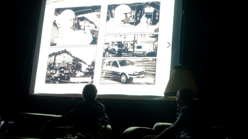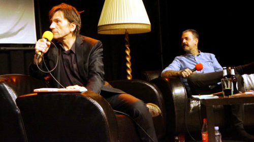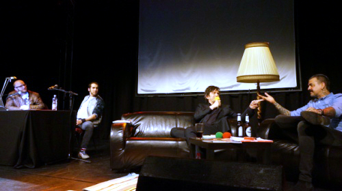 Auf der Bühne stehen Sofa, Stehlampe, Couchtisch, Bier und Laptop. Die Macher des Bookzines präsentieren sich gelassen und aufgeschlossen, wirken nicht wie erfahrene Journalisten, die in erbarmungslosen Recherchen jede noch so kleine Ungereimtheit ans Licht bringen, sondern wie die nette Runde, die sich zum Bundesliga gucken trifft. Am Computer koordiniert David Schraven die Slideshow auf der Leinwand, hinter seinem Mikrofon versteckt sich Bastian Schlange, auf dem Sofa hat es sich Blogger Sascha Bisley bequem gemacht. Moderiert wird der Abend von Martin Kaysh, seines Zeichens gelegentlicher Ruhrbaron und Autor für WDR und ARD.