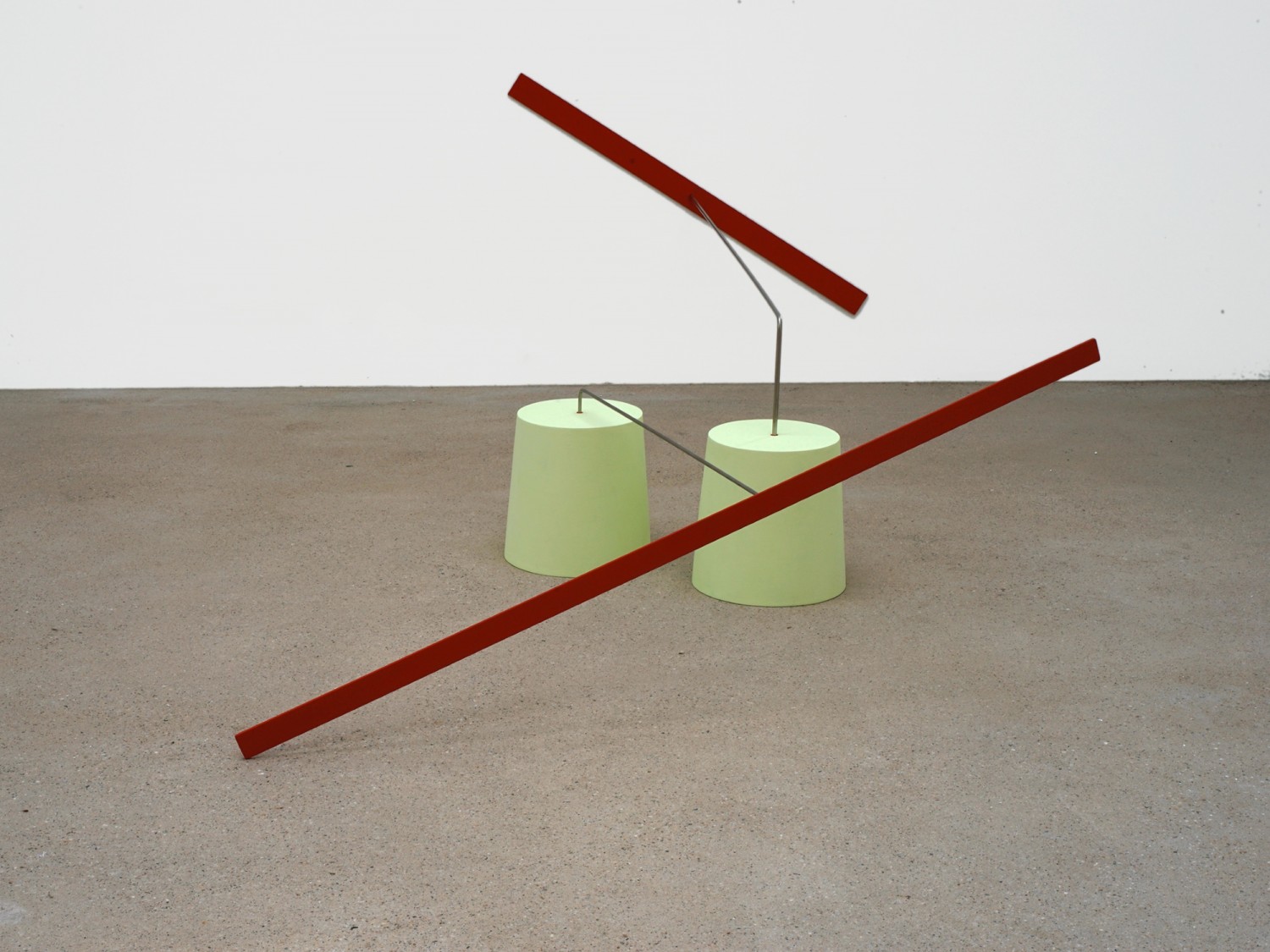 Ihre Werke bestehen aus den industriellen Materialien unserer Gegenstandswelt, sie erinnern an funktionale, technische Konstruktionen. Die Linie erweist sich als konstitutiv, neben die Vertikale und die Horizontale tritt gleichberechtigt die Schräge. Farben kommen selten vor, sind dann aber genau gesetzt. Und dann stellt man fest, dass die standardisierte Formulierung unterlaufen und die Klarheit der Konstruktion eben doch nicht so klar ist. Die Formbeziehungen treten in den Vordergrund – erst recht indem der Luftraum das Skulpturale weiter konstituiert, wie Monika Brandmeier betont. Und Hans-Jürgen Schwalm, der Direktor der Kunsthalle Recklinghausen, erwähnt das Erzählerische, das schon durch die Wahl der Materialien in Gang gesetzt wird. Damit verbunden sind das Poetische, aber auch die Sachlichkeit des Auslotens der Schwerkraft zwischen Wand und Boden. „Manches kann einfach umfallen“, sagt Monika Brandmeier.