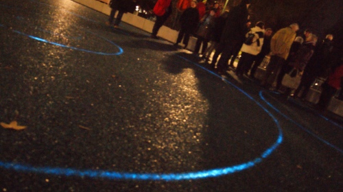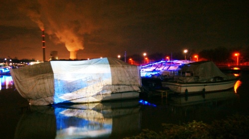 Dann geht es weiter zur Marina Rüthe, ein Yacht-Hafen am Datteln-Hamm-Kanal in Bergkamen. Ein sehr idyllischer Ort, der an diesem kalten Novemberabend als Kulisse für Lichtkunst inszeniert wird: Projektionen auf die winterfest geschnürten Boote, das Spiegeln der beleuchteten Yachten auf der Wasseroberfläche oder die Lichtzeichnungen, die die Künstlerin Nikola Dicke an die Wand der Adam-Kühlerfabrik werfen lässt. Wem es zu kalt wird, sich für eine Bootstour anzustellen, drängt in das warme „Trauzimmer“ des Yachthafens. So wie ich. Denn drinnen gibt es Live-Musik des Duos Mondi di Notte. Die Mischung aus Musik und Lyrik ist eine nette Abwechslung, bevor es mit dem Reisebus weitergeht nach Bönen.