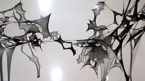 In Heinsberg wird dieses bildhauerische Material auch wie Malerei benutzt, es ist schon ziemlich ungewöhnlich, wie sich das Nylon dreidimensional von der Wand in den Raum bewegt, in malerischen Strukturen neue Sichtweisen fordert, um am Ende selbst auf traditionellen Keilrahmen zu bestehen.