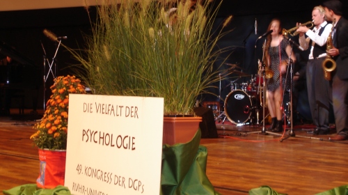 Für Freud wäre der Fall klar gewesen: Narzissmus hätte der Wiener Seelenklempner, der für heutige ForscherInnen und PsychologInnen nur noch der peinliche Startschuss der eigenen Disziplin ist, wohl angesichts des bunten Treibens im Audimax diagnostiziert. Denn beim Psycho Slam im Rahmen des 49. Kongresses der deutschen Gesellschaft für Psychologie feierte das Fach, das es seit 50 Jahren an der RUB gibt, vor allem sich selbst: Blumen zierten die Bühne des ordentlich gefüllten Audimaxes, feierliches Grün rahmte das RUB-Logo ein und die Swing-Band Botticelli Baby blies beste Laune in den Saal.