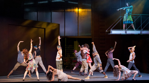 Aber wenn die Tanz-Truppe spielen muss, beginnt das Dilemma der Inszenierung: Da radebrecht der Anführer der einheimischen Jets (gespielt von US-Bariton Benjamin Wert): „Dieses Viertel gehört uns“ – und schon glaubt man den Konflikt mit den puertoricanischen Einwanderern nicht, deren Banden-Anführer Bernardo von einem Deutschen (Philipp Manuel Rothkopf) verkörpert wird. Noch abstruser wird es, wenn Teilmans den Chilenen Patricio Arroyo als waschechten US-Boy Tony auf den Balkon schickt, um seine Maria (Rosemarie Weissgerber) anzusingen. Und ihr typischer „Regie-Theater“-Einfall, zu Beginn und am Ende eine gealterte Maria (Irena Orawiec) auftreten zu lassen, die den halbnackten Tänzern die Sixpacks befingern darf, wirkt allzu bedeutungsschwanger. So scheitert die Inszenierung letztlich, wenn auch auf hohem tänzerischen Niveau.