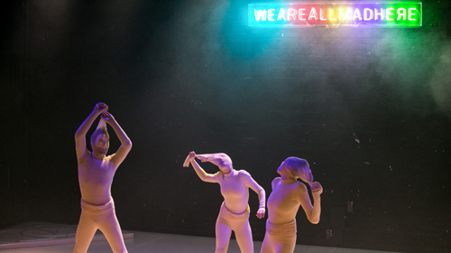 Es geht los. Die drei Homunkuli, die sich wie das kleine Mädchen nennen werden, performen erst einmal das Knäuel, wälzen sich über die Bühne, verknoten, entwirren, schälen sich aus ihren Schläuchen, erhalten Gesichter und – sprechen. Benennen ihr Tun, setzen verbal die beleuchtete Szenerie im Nichts, Knochen, Haken, Königin, nur was nicht ist, ist möglich, „trink mich“. Ist das Gift? Hinter der Fantasie steht die reale Welt, oder? Hula-Hoop-Reifen bringen Bewegung ins Spiel, sie blinken. Es gibt also einfache Regeln im Spiel. In der Performance, als auch in der Handlung, schließlich muss die Geschichte ja transportiert werden, und da reichen Dialoge zwischen Alice und Alice und Alice nicht aus. „We are all mad here“: Erklären die seltsam verbaselten Leuchtbuchstaben das weiße Kaninchen?