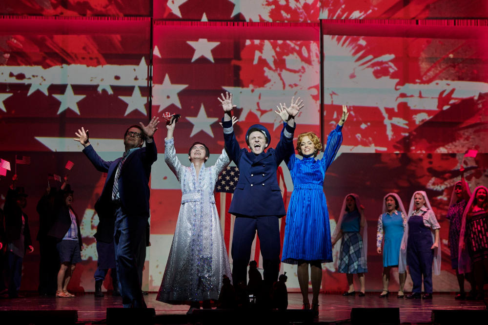 Berger sieht Adams Oper nicht wie Tomo Sugao 2018 in Würzburg als beziehungsreiche Polit-Parabel. Er will den Blick auf die unterdrückten Frauen richten, auf von Männern gemachte Politik und Ideologie. Sein Mittel der Kritik ist die Übersteigerung in surreal geronnenen Kitsch, in eine überdrehte Show. Wenn im zweiten Akt Nixons Ehefrau Pat – nicht viel mehr als eine naive, amerikanische höhere Tochter – Fabrik und Kommune, Museum und Ballett besucht, überflutet die Bühne ein Meer clownesker Gestalten in lindgrün, schweinchenrosa und himmelblau (Kostüme: Alexander Djurkov Hotter). Im dritten Akt, der eigentlich nur noch eine Meditation über Gedankenfetzen und Aphorismen ist, flanieren bestimmende Gestalten der letzten 50 Jahre an der Tafelrunde der Politik-Senioren vorbei: Marx Arm in Arm mit dem Papst, Margaret Thatcher, Honi und Margot, der alte Revolutionär Fidel Castro. Und Degyun Jeong als Chou En-lai stellt die entscheidende Frage, „wieviel von dem, was wir taten, gut war“.