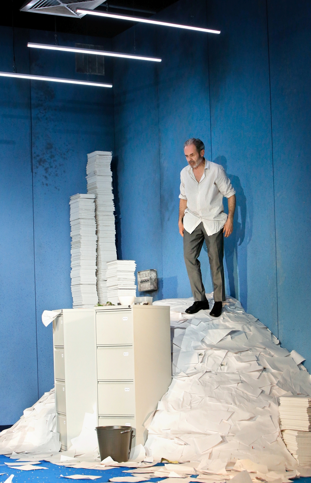 „Onkel Wanja“, Foto: Birgit HupfeldWas diese finale Eskalation nicht durchbricht, das sind die Rastlosigkeit und Unruhe. Dabei steht die Uhr im Office still. Der Zeiger zeigt genau zwanzig nach zwölf an, obwohl die Figuren etwas anderes ablesen. Ein rasender Stillstand beherrscht das Dasein dieser Tschechow-Figuren, mitsamt einem Bornout-Wanja, der den Wiederholungszwang verkörpert, indem er zwischen Papierbergen und Aktenordnern hechelt. Arbeit und Erschöpfung beschert ihm Tschechows Landleben. Dabei wartet Wanja auf das Glück.