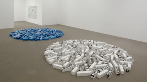 Petersburger Hängung geht anders. Die Galerie m in Bochum zeigt mit „If and when“ neue Werke des amerikanischen Künstlers Peter Wegner. Der Yale-Absolvent hat drei der vier gezeigten Werkgruppen eigens für die Räume im Schlosspark am Haus Weitmar konzipiert. Erst einmal wirkt alles ziemlich leer, ruhig und spröde. Die angekündigte Poesie des Alltags ist auf den ersten Blick nirgends zu entdecken. Raumgreifend ist die Installation „Atlas Blue“: Zwei Kreise aus 312 unterschiedlich langen, lackierten Balken. Blau trifft dabei auf Weiß, spärliche kryptische Bezifferungen wie „6 Blue Sky“ sollen Farbbezeichnungen sein, eines von Wegners Ordnungssystemen. Handelsübliche Farbkarten aus Deutschland und Amerika inspirieren den Künstler aus South Dakota, dessen Arbeiten auch in den renommierten New Yorker Kunsttempeln Guggenheim und Museum of Modern Art hängen. Seine Affinität zu Bezeichnungssystemen kommt von deren Bemühen um klare Verständigung und Zuordnung von Begriff und Farbton. Das Chaos um Farbe als Ware der unterschiedlichen, internationalen Hersteller mit ihren jeweils ganz eigenen, gleichwohl assoziativen Bezeichnungen ist in seinen installativen Werken losgelöst von der industriellen Zweckmäßigkeit, hinterfragt das Tatsächliche hinter den Chiffrierungen. So ist das auch bei „Oasis Oase“, ein schlichtes Diptichon in Doppelgrün mit zwei unterschiedlichen Farbtonbezeichnungen, bei denen Zugang und Begrifflichkeit nebensächlich sind.