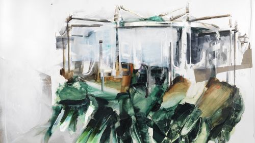 Die Orte ihrer Fotografien sind verwaist und leer geräumt. Ihre Skulpturen stellen im modellhaften Maßstab Haus- oder Schiffsreste aus Holzresten dar. Und dann die Malereien: Von der Achterbahn eines Vergnügungsparks steht nur noch ein Skelett aus Verstrebungen; Bauwagen und Häuser wirken vernutzt in einer unwirtlichen Landschaft. Augenblicklich erhalten die Sujets symbolhafte Züge. Ein organisch geschwungener Schiffsrumpf lässt etwa an einen Drachen denken. Die Farben dieser Bilder sind fahl, verhalten sich oft zwischen Beige und Braun, die Buntheit scheint diesen Malereien mit kontrolliert heftigen Pinselhieben ausgetrieben. Menschen halten sich an den Orten dieser Malerei nicht auf. Aber die Konstruktionen weisen auf sie als Erbauer und signalisieren oft einen Fortschritt, der seine Grenzen erreicht hat und kollabiert ist.