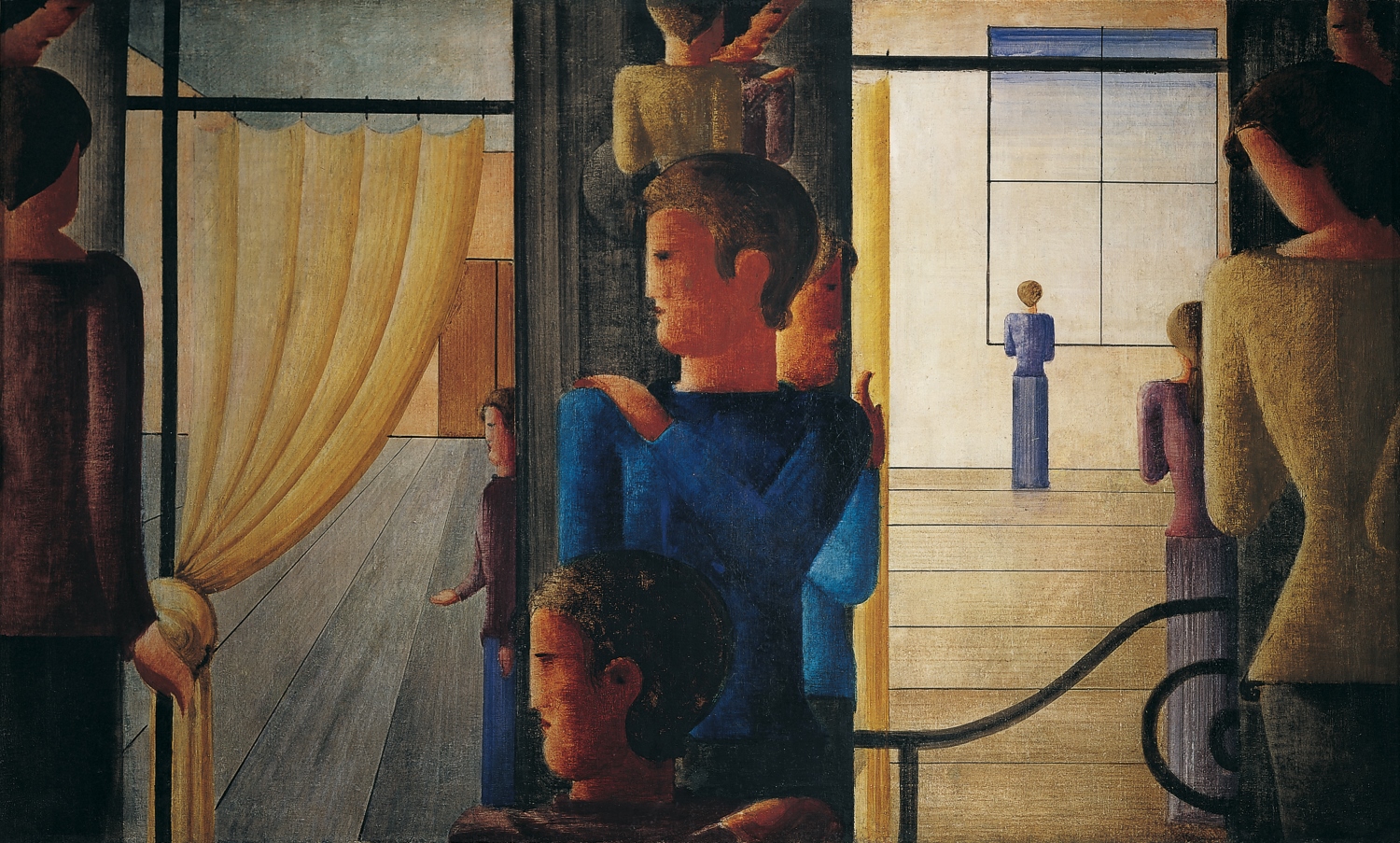 Ein peripherer Anlass für die Ausstellung ist das 100-jährige Jubiläum der Bauhausgründung: Oskar Schlemmer, der zwischen 1906 und 1918 an der Kunstakademie in Stuttgart bei Adolf Hölzel studiert hatte und seither mit Willi Baumeister befreundet war, lehrte in Weimar und in Dessau u.a. figürliches Zeichnen und Bühnenkunst. Berühmt ist er vor allem für seine Wandgestaltungen und das von ihm erfundene „Triadische Ballett“, bei dem die Tänzer auf die geometrische Struktur der Bühne hin agieren, stets in einer summarischen, existenziell und zeitgenössisch begriffenen Menschendarstellung. Die vielleicht bekannteste davon, „Zwölfergruppe mit Interieur“ (1930), gehört zum Sammlungsbestand des Von der Heydt-Museums und ist nun in der Ausstellung zu sehen.