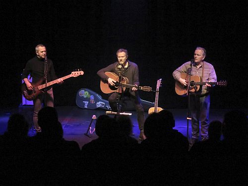 „Ik bün tohuus in't blaue Lücht van d' Nörden“ singen und spielen Songschreiber Otto Groote, der exquisite Leadgitarrist und Begleitvokalist Matthias Malcher und, wunderbar einfühlsam, Bassgitarrist Ralf Strotmann im ersten Song des Abends, „Iesmeerwellen“. Nicht nur der weiße Schwan aus dem Lied, auch das aufmerksame Publikum fliegt mit, „an d' Noordmeerstrand“. Country, Folk und Bluegrass spürt man im Spiel der Band, es klingt warm, gekonnt und lässig, und Grootes sonorer Gesang erinnert in manchen Momenten an einen anderen, bekannten Wahlfriesen: Hannes Wader. „Iesmeerwellen“ war auch Grootes erster Song überhaupt, vor fast 20 Jahren geschrieben, nachdem er sich endgültig dazu entschieden hatte, die Musik in den Mittelpunkt seines Lebens zu stellen.