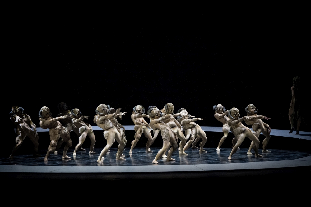 Hinzu kommt der Hirsch, den Arthur Henderson mit zwei Krücken gibt, die er akrobatisch als zwei weitere Tanzbeine zu schwingen weiß. Guillem Rojo i Gallegos Tod erscheint zwar, als hätte er sich aus Ingmar Bergmanns „Das siebente Siegel“ verlaufen, wenn er regelmäßig aus einem schwarzen Felsenhügel kriecht, der an die Landschaften von Tolkiens Mordor (Bühnenbild: Marko Japelj) erinnert . Zugleich versprüht diese Personifizierung stolze Mephisto-Vibes. Denn faustischen Beistand braucht dieser Gynt auch angesichts der toxischen Verwüstung, die er anrichtet. So ist Clugs Ballett-Adaption nicht bloß eine flotte Ibsen-Verramschung, die den Stoff mit märchenhafter Ästhetik ausstaffiert, sondern auch eine choreografische Beleuchtung von Gynts toxischem Machtstreben.