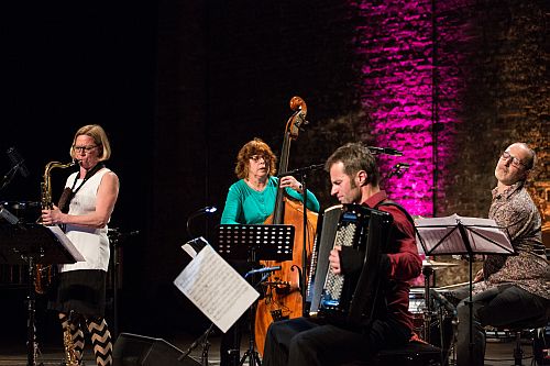 Das No Tango Quartet tritt seit zehn Jahren inner- und außerhalb Europas auf. Das offensive, jazzige Spiel von Christina Fuchs an Klarinette und Saxophon verwebt sich zeitweise so eng mit dem Spiel von Florian Stadler am Akkordeon, dass scheinbar jede Note von irgendeinem der beiden Instrumente gespielt sein könnte. So nah kommen sich die Klangbilder, wenn die beiden Musiker es wollen. Zusammen mit Ulla Oster am Kontrabass und Christoph Hillmann am Schlagzeug folgen sie außergewöhnlichen Rhythmen: Die beiden Frauen betonen ihre Neigung, Kompositionen auf der Zahl 11 aufzubauen. Aber das interessiere vermutlich nur Musiker, schmunzelt Ulla Oster, Laien sollten sich davon nicht beeindrucken lassen.