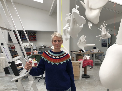 Die Düsseldorfer Künstlerin (geb. 1959), die seit 2000 als Professorin für Bildhauerei in Hamburg lehrt, gehört zu den Künstlerinnen, die seit den späten 1980er Jahren die menschliche Figur wieder als Gegenstand der Skulptur etabliert haben. Sie beginnt um 1990 u.a. mit langgestreckten, wie aufgebarrten Frauenakten aus Filz, die wie schwebend unter einer Konsole liegen. Seitdem zieht sich das Verhältnis von dinglicher und erinnerter Substanz durch ihr Werk. Immer wieder sind die in wechselnden Techniken geschaffenen Figuren entrückt, scheinen sich selbst zu träumen, besitzen dann wieder alltägliche Accessoires, die Erzählungen initiieren, oder übersetzen kunstgeschichtliche Darstellungen in Leiblichkeit voller Lebensfreude. Stadtbäumer befragt unser Verhältnis zur gegenständlichen Umgebung in einer zunehmend virtuellen Welt. Dies betrifft auch ihre jüngere Serie mit hängenden, der Hand ähnelnden weißen Plastiken, die alltägliche, nun ebenfalls weiße Dinge halten.