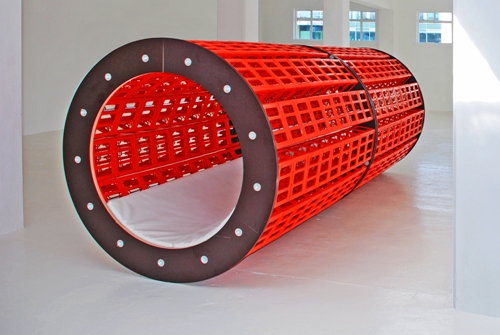 Das Künstlerteam Winter/Hoerbelt arbeitet heute noch mit ähnlich unspektakulären Alltagsmaterialien. Denen entlocken sie aber überraschende ästhetische Qualitäten: Ihre raumgreifende „Red Tube“ (2016) ist eine betretbare rote Riesenröhre, die sich erst auf den zweiten Blick als Gebilde aus verknüpften Getränkekisten entpuppt. Einfache Materialien werden Skulptur oder Bild, wie auch die innen gefärbten Federstahlringe an der Wand, die zarte pastellfarbene Schattenbilder werfen. Das ist zeitgenössische Minimal Art vom Feinsten, ähnlich kraftvoll wie Bruce Naumans Video (1968), auf dem er seinen Kopf und Oberkörper mit schwarzer Farbe einreibt und wieder blank wischt. Philipp Goldbachs Schalttafeln und Typoscheiben betonen die Materialästhetik und den Reiz des Seriellen, aber seine und Benedikt Terwiels Landkarten lassen Fragen offen. Den starken Schlussakkord setzt eine in situ geschaffene Installation der Bildhauerin Franka Hörnschemeyer, die in diagonal geführte Drahtseilverspannungen vereinzelte Bau- und Schalelemente eingebunden hat – wie frei schwebend. Der Raum wirkt durch diese wenigen Objekte leicht und luftig, ist dennoch komplett besetzt und unbetretbar ausgefüllt. Für Kunstkenner, die Formen- und Materialsprache lesen können, ist die Ausstellung ein Feinschmeckermenü, für Gelegenheitsbesucher eher ein Knochen.