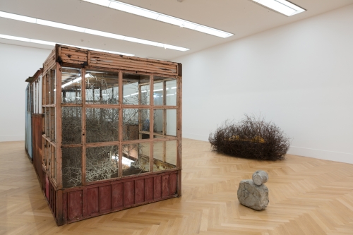 Einen Schritt weiter steht man in Bonn in einem Filmset, dessen Video noch nicht gedreht wurde. Dürre hat Besitz ergriffen von Pflanzen und Objekten, rostige Stäbe teilen Bereiche ab, die Leere scheint bedrohlich. „Secret that mountain kept“ (Rauminstallation, 2018) ist neu und bezieht sich auf eine Katastrophe in Tiflis, wo im Juni 2015 nach Dauerregen im Zoo rund 300 Tiere in den Fluten ertranken. Ein entkommener weißer Tiger tötete einen Mann und wurde erschossen. In Chachkhianis Installation ist dieses Szenario längst vorbei, das Wasser ist weg, die Vegetation verdorrt. In den Volieren trockene Büsche, aber keine Tiere, und doch, auch hier scheint ihre Abwesenheit eine merkwürdige Präsenz zu erzeugen. Freiheit erlangten die Tiere nur durch den Tod. Die rostigen Stangen lassen sich jetzt als Reste von Gehege identifizieren, in zahlreichen drögen Büschen haben sich Kinderkarussell-Tiere verfangen.