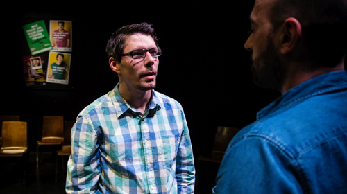 Nach einigen quälenden Sekunden kommt auch jemand. Das ist Alexander Ritter als arbeitsloser Schauspieler Ben, der keine Lust mehr in Berlin so rumzuharzen und aktuell die Fördertopfe des Kultusministeriums anstechen möchte. Lessing in der Schule geht da immer, blöd nur heutzutage – und das ist kein Witz im Schmelztiegel Berlin, geschweige denn im nicht gerade kulturaffinen sozialdemokratischen NRW – braucht man einen Alibi-Ausländer, gern aus Afrika oder Arabien, ein Türke reicht, soweit sind wir schon, und deshalb muss man bereits Theaterchefin Romy Schmidt für die Ansetzung von „Bilge Nathan" dankbar sein; die Regie macht sie natürlich auch beim Zweipersonen-„Kulturdesaster". Ben kommt also allein, sein Kumpel Mehmet, genannt Memo ist „natürlich" nicht da. Typisch. Fördergelder für Integration und Toleranz ja, aber deutsche Pünktlichkeit – das ist etwas anderes.