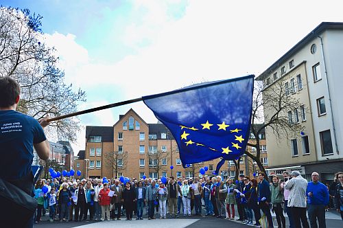 500 Menschen sind zum Bochumer Platz des Europäischen Versprechens gekommen, um sich für ihre Version der Zukunft von Europa stark zu machen. Über den Köpfen wimmelt es von geschwenkten Europafahnen und blauen Luftballons mit den Europa-Sternen. Nach einer kurzen Begrüßung übergeben die Veranstalter das Mikrofon an die Demonstranten. Jeder, der etwas zu sagen hat, findet bei „Pulse of Europe“ seine Stimme – und Gehör. „Ich bin vor dem zweiten Weltkrieg geboren. Deshalb sind meine Vorstellungen für Europa auch etwas anderes, als die der meisten jungen Leute heute“, erklärt Marie-Luise Bartz. In der „Pulse of Europe“-Bewegung rücken Senioren, junge Familien und Studenten eng zusammen und teilen viele gemeinsame Ideen. „Wer die Bombennächte miterlebt hat, muss einfach dafür kämpfen, dass so etwas nie wieder passiert.“ Auch darin herrscht Einigkeit unter den Demonstranten – ob mit oder ohne persönliche Kriegserfahrung. Diesen Gedanken verbreiten die Veranstalter auch in ihren Flyern: Wer Frieden will, muss sich für Europa entscheiden!