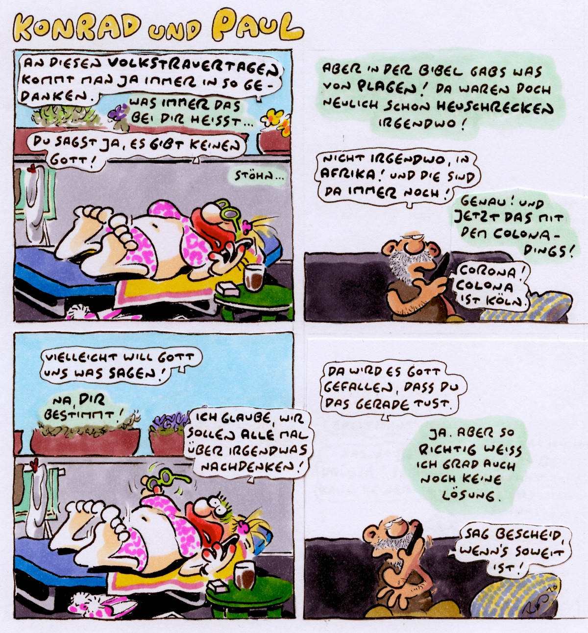 Für mich auf jeden Fall. Das Buch sollte um Political Correctness gehen, das wäre nicht einfach geworden. Da verlieren die Leute ja schnell jeden Humor. Ich hätte also in alle Fettnäpfe gleichermaßen treten müssen, nicht nur in ein paar. Aber dann war plötzlich Lockdown und für ein paar Wochen interessierten diese Kontroversen keine Sau mehr! Und ich war in der wunderbaren Situation, eine ganz frische Idee sofort umsetzen zu können, nämlich Konrad und Paul in der Krise. Täglich auf Facebook und Instagram, acht Monate lang. Das klassische Comicstrip-Format, also 4 Panels, Pointe, fertig, hab ich selten bedient, auch das war neu und machte super Spaß. Und die Online-Kommentare jeden Tag haben meinen Dopaminpegel auch gepuschelt. Zum Herbst hin war ich etwas erschöpft, aber bis dahin war das Zeichnen eine reine Freude.