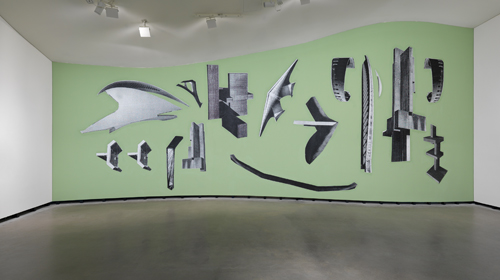 Im Zugriff auf zeichnerisches und fotografisches Material aus dem Internet und aus Printmedien hat Frauke Dannnert Segmente modernistischer Architektur isoliert, die sie zugleich konzentriert und abstrahiert. Das ist genau und ganz gezielt: Sie ruft zerstörte Gebäude ins Bewusstsein und hinterfragt das Besondere bestimmter Bauten und liest diese ästhetisch, mit einer Wendung ins Utopische. Dass Architektur (funktionale und gesellschaftliche) Aufgaben zu erfüllen hat und sich ihre Konstitution daran orientiert, schwingt in diesen Bildern durchaus mit. Frauke Dannert hat diese Bildformen bei ihren Wandbildern aufgegriffen, wobei sie Laserprints in eine monochrome Malerei integriert. Dies führt zugleich zu ihren komplexen Installationen, die auf die Räume ihrer Präsentation Bezug nehmen. Frauke Dannert legt Teppichstücke aus, welche Formen der Architektur in ein Muster übersetzen. Auch ihre Overhead-Projektionen solcher Strukturen werden als Teil der Umgebung erfahren. In Witten bespielt Frauke Dannert nun die sechs Räume im Wechselausstellungsbereich: Genug Platz, um das bisherige Repertoire auf Erkenntnisse über den Ort anzuwenden.