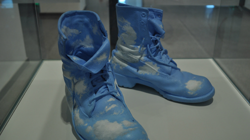 Zehn Arbeiten im Schaufenster des Museum Ostwall im Dortmunder U reichen, um zu zeigen, was für ein genialer Künstler der New Yorker Geoffrey Hendricks (geb. 1931) ist. Er richtet seinen Blick Richtung Himmel. Dieser ist, in einem ganz bestimmten Hellblau mit hohem Wiedererkennungswert, im Sinne des Kosmologischen sein zentrales Sujet. Seine Haltung ist kontemplativ, konzentriert und romantisch, die Werke wirken traumhaft und leichthin, und Ausgangspunkt sind doch der Mensch und die Erde. Es gibt verschiedene Wege von der Erde zum Himmel und den Wolken. Da sind die „Boots“ mit der robusten, aber ausgetretenen Sohle, die selbst schon im hellen Blau mit weichen weißen Formen bemalt sind und dadurch schwerelos wirken. Oder die „Himmelsleiter“, die Hendricks zum Tod seines Fluxus-Kollegen Al Hansen angefertigt hat: eine gewöhnliche Leiter mit Aquarellen zwischen den Sprossen. Die Blätter zeigen jeweils einen Nachthimmel mit dem gelben Vollmond, der Himmel ist schwer, dunkel, fast schwarz.
