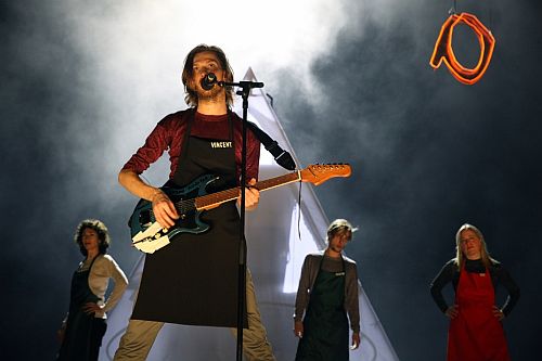 Ein großes weißes Zelt steht in der Mitte der „Bühne 3“ des Ringlokschuppens. Davor sitzen im Halbkreis die vier DarstellerInnen des Abends, ausgerüstet mit Gitarre und kämpferischem Liedgut. Sie wollen uns „Die Geschichten der Angie O“ erzählen, die immer als erste ihr Zelt da aufschlägt, wo Protest notwendig wird. Doch wer ist diese „Angie O“? So ganz genau weiß das auch auf der Bühne niemand. „Angie is gone“ heißt es gleich zu Beginn dieser Inszenierung, die zwischen Theater, Musical, Performance und Demonstration changiert. Geblieben ist von „Angie O“ nichts als ein leeres Zelt und eine große Portion Idealismus, die nicht so Recht weiß, wohin. Also machen sich die vier AkteurInnen auf die musikalische Suche danach, wofür es sich heute zu kämpfen lohnt. Wer „A“ sagt muss auch „B“ sagen. Aber was, wenn unklar geworden ist, was dieses „A“ am Anfang einmal ausgemacht hat? Wenn alle guten Grundsätze inzwischen vereinnahmt sind von schicken und mächtigen Konzernen? Wie kann man gegen Globalisierung kämpfen, wenn die Bewegung längst global geworden ist?