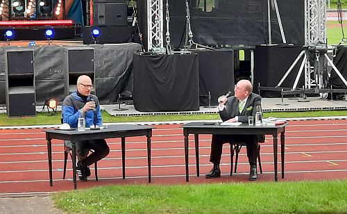 Nicht die drei ???, sondern die drei GGG sind zugangsberechtigt zu den Veranstaltungen der diesjährigen Ruhrfestspiele. Selbst vor Einlass in das Stadion Hohenhorst, wo die Veranstaltungen open air stattfinden und am Platz eine Maskenpflicht gilt, wird geprüft, ob die Gäste geimpft, genesen oder getestet sind. Man merkt, wie sehr die Kultur bemüht ist, in diesen Öffnungsphasen bloß nicht zu leichtsinnig zu werden, bloß keine Fehler zu machen, die das zarte Pflänzchen erster Live-Veranstaltungen vor echtem Publikum wieder gefährden könnten. Schließlich mussten die Ruhrfestspiele ihre Maitermine fast komplett ins digitale Festspielhaus verlegen. Die gründlichen Einlasskontrollen, die nur sehr eingeschränkte Gastronomie im Außenbereich und die Maskenpflicht können aber die Freude des Publikums nicht trüben. Das Stadion selbst, das sportlich von den Damen des 1. FFC Recklinghausen genutzt wird, ist als Veranstaltungsort ein Juwel. Von dem in seinen Glanzzeiten 30.000 Personen fassenden Stadion wird heute nur noch eine überdachte Sitztribüne genutzt, die übrigen Tribünen sind von Gräsern überwuchert, bilden ein wahres Biotop. Auf dem Rasenplatz ist eine Bühne mit Licht- und Tontechnik aufgebaut und bei einem ersten Blick ins Rund übersieht man leicht die beiden Tische auf der Tartanbahn, die Schauplatz des literarischen Dialogs werden sollen.