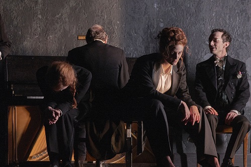 Davor tappen sechs Schauspieler in schwarzen Wracks. Und sie erweisen sich als hochmusikalische Klangkünstler, wenn sie Volkslieder anstimmen, von Thomas Moores „Silent O'Moyle“ bis zu Leonard Cohens Popballade „Take this Waltz“ oder auf dem Klavier Bach und andere Interpreten spielen.