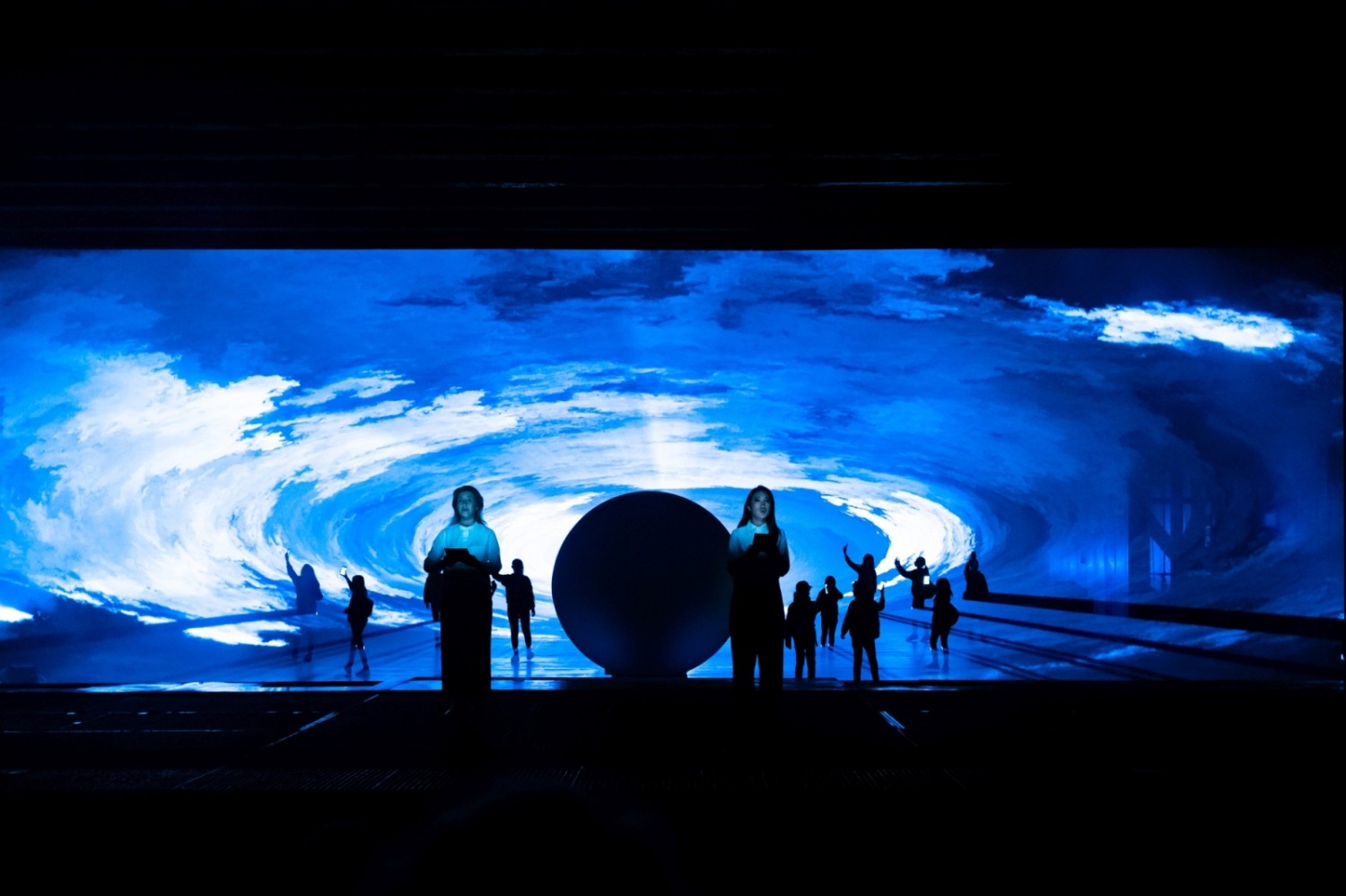 Und wieder beendet die stürzende Sintflut die Szenerie. Wasser strömt aus allen Gerätschaften, macht aus dem Bühnenbild eine Installation, eine Performance der Zerstörung, die den dritten Teil, die Jetztzeit nur physisch reinigt, Jonas, Lénas Sohn im digitalen Chatroom mit seinen Schulfreunden, der Antisemitismus hat längst die Kurzmitteilungen geflutet, eine Laserinstallation verdichtet den Raum. Am Ende bleibt still eine blaue Kugel zurück, auf der die Wolken ziehen, doch auch ihr Licht verlöscht, die Ergriffenheit bleibt.