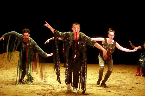 Neben diesen folkloristischen Kostümen schlüpfen die Bühnenakteure auch in Alltagskleidung. Sie tragen Capes oder Tücher als Kopfbedeckungen, mit der sich Migrant:innen vor der prallen Sonne schützen. Dass die Hitze an diesem Grenzstreifen noch die geringste Gefahr ist, zeigte eine Szene während der Choreographie: Einer aus der Gruppe mimt, von einer Schlange gebissen zu sein, er fällt in den Sand und zappelt.