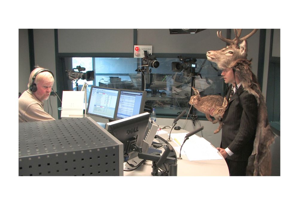 Der zweite Raum gehört dem Briten Marcus Coates – mit zwei ungewöhnlichen Videos. 2006 erregte der Performer und Ornithologe in Norwegen mit seiner Ritual-Aktion „Radio Shaman“ internationale Aufmerksamkeit. Was würden Sie sagen, wenn Sie abends an einer Straßenecke einem Hirsch mit zwei toten Hasen in der Hand begegneten?