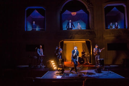 Auf den Plakaten im Zuschauerraum prangt das faltige Gesicht eines alten Haudegen. „A tribute to my father. Hamlet“ steht darunter. Schon darin liegt eine Provokation des dänischen Hofes, aber die Honoratioren machen gute Miene zum bösen Spiel. In der Mittelloge (Bühne: Claudia Rohner) thronen König Claudius und seine Frau Gertrud, linkerhand redet Ratgeber Polonius auf seine Kinder Ophelia und Laertes ein und rechts schwafeln die Pollunderboys Rosenkranz und Güldenstern. Auf der Vorbühne allerdings veranstaltet Hamlet und seine Band „Woods of Birnam“ sein Tribute-Konzert für seinen ermordeten Vater.