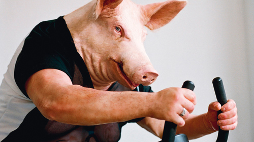 Aber es gibt auch andere leichter zu ertragende Hingucker in Dortmund. Auffällig Deborah Sengls „All You Can Lose“-Schweineobjekt von 2009, wo eine präparierte Sau auf einem Heimtrainer sitzt und sich die Pfunde runterschwitzt. Vergnüglich wie immer Timm Ulrichs „Wolf im Schafspelz – Schaf im Wolfspelz“ von 2005 (erst 2010 mal wieder restauriert). Die beiden Protagonisten starren sich an, der Wolf lieb und nett, das Schaf ziemlich martialisch, ich gebe zu, die „Mutation“ ist auf den ersten Blick kaum zu erkennen. Das ist bei Patricia Piccininis „The Comforter“ (2010) nicht anders. Erst einmal sitzt da aus der Entfernung ein Kind mit Ferkel in der Ecke. Doch beim Näherkommen verwischen sich die Realitäten. Para-Humans nennt die australische Künstlerin ihre Mischwesen aus angenommener rekombinanter DNA. Das Kind ist ein Wolfsmädchen, wie unschwer am Fell ihrer Beine erkennbar wird. Im Arm kein Ferkel, sondern ein hybrides Wesen.