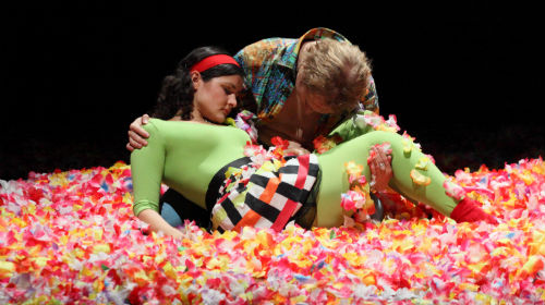 Ein wunderbares Bild gleich zu Beginn. Die Liebenden schaufeln haufenweise Blüten auf die nackte Bühne, ein buntes Meer, auf dem sie noch ausgelassen tanzen, bevor die Intrige ihre Pfeile aussendet. Ein in den Kostümen modernes Paar, deren Befindlichkeit oft mit der Musik der Indie-Band Archive gespiegelt wird. Die von Broll-Pape oft genutzte Videotechnik liefert in dieser Inszenierung dagegen nur Überschriften. Ausgezeichnet sind ihre Personenführung und die Choreografie auf der doch knappen Bühne. Nichts wirkt gestelzt oder aufgesagt; Schiller auf zeitgenössischem Sprachniveau, ohne seinen Rhythmus zu verfälschen.