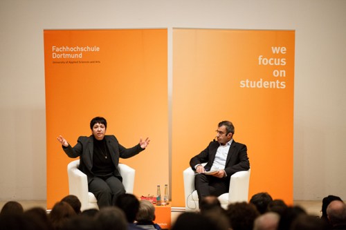 Ateş spricht sich also aus für einen grundsätzlichen Zweifel am fertigen Wort. Keinen Zweifel hingegen lässt sie an ihren Überzeugungen und Zielen. Darüber spricht sie vor einem gut gefüllten, keineswegs ausgelasteten Hörsaal in der Fachhochschule Dortmund in der Reihe „Gehört der Islam zu Deutschland?“ Selbstverständlich ist es kein Widerspruch, wenn sie in der so benannten Reihe spricht, denn auch Zweifler kommen um fertige Worte nicht herum. Der Titel ihres Vortrags: „Der Islam lässt sich mit der Moderne vereinbaren!“ – mit Ausrufe-, nicht Fragezeichen. Ihre Rede wolle sie kurz halten, damit mehr Zeit für Diskussion bleibe; sie wird sich dran halten.