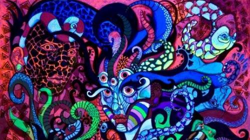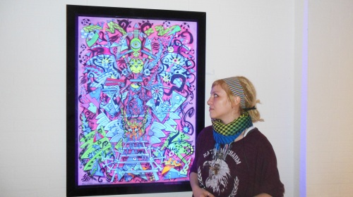Allerlei Getier, Formen und Symbole tummeln sich zunächst unübersichtlich in fluoreszierender Farbvielfalt. Die im Rahmen installierten UV-Leuchten bewirken, dass die Motive wie in Schichten auf Glas aufgetragen scheinen. Ineinander verwobene Tier- und Menschenkörper erzielen einen dreidimensionalen Effekt, vermitteln den Eindruck ständiger Bewegung. (Alp)traumhafte Szenarien entfalten sich, wie in „Head structure building from a dream“. Buzu erklärt, dass es sich um ein Motiv aus einem Traum handelt. Kleine Figuren versuchen Ordnung in ein chaotisches, mechanisches Getriebe zu bringen, defragmentieren den Verstand. Das Chaos aus Rohren, Schrauben, Gesichtern und Tentakeln erinnert an eine surrealistische Pop-Variante von Hieronymus Bosch. Vor „New years eve puzzle“ hört man das typische Gerede Kunstbeflissener, schlaue Theorien inklusive. Wie erfrischend, dass Buzu eben jenes Bild kurz zuvor folgendermaßen beschrieb: „Es war das erste Silvesterfest, dass ich nüchtern erlebt habe, während alle meine Freunde betrunken waren.“ Psychedelische Bewusstseinszustände und Momentaufnahmen aus dem Unterbewusstsein prägen die Serie. Deren Titel, „Another language“, spielt auf eine instinktive Sprache an, die dem Bewusstsein verborgen bleibt.
