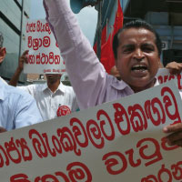 Die Flut ist auch in der Hauptstadt Colombo angekommen: Mitarbeiter einer Bank protestieren gegen die Reduzierung ihrer Rentenansprüche – und gegen die Preiserhöhungen von Lebensmitteln in Folge vernichteter Ernten. |