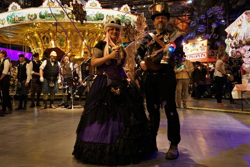 Christina Schröder (38) und ihr Mann Tom Kirstein (41) sind hingegen begeistert: „Für uns ist es der Jahresauftakt und gleichzeitig auch unser Lieblings-Steampunk-Event“, erzählt Christina. Besonders die Kulisse und die Fahrgeschäfte haben es ihnen angetan. Nachdem sie das erste Mal den Steampunk-Kleidungsstil gesehen hatte, schwärmte sie ihrem Mann davon vor und bald gingen die beiden gemeinsam zu ihrem ersten Event: „Da gingen wir völlig unter und die anderen wurden fotografiert“, erinnert sie sich. Doch die „gemeinsame Leidenschaft“ war geweckt. Um beim nächsten mal auch fotografiert zu werden, wurde an aufwändigeren Gewändern gearbeitet und der Plan ging auf. „Ich tüftele einfach gerne“, erzählt Tom, der die meiste Arbeit übernimmt. Für ihn sei das Entspannung. „Und wenn ich Glück habe, kommt etwas Gutes dabei heraus“, sagt er. Und Christina fügt hinzu: „Und ich trage es einfach gerne.“ Auch beim diesjährigen Steampunk-Jahrmarkt gehören Christina mit ihren großen Schmetterlingsflügeln aus Metall und Tom mit seinem dampfenden Zylinder wieder zu den beliebtesten Foto-Motiven.