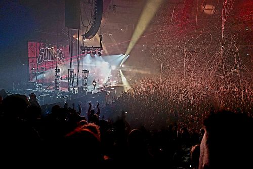 Die Musik zur Umbaupause ist dann auch gespickt mit Klassikern des amerikanisch geprägten Skate-Punk. Das von Neck Deep warmgespielte Publikum singt auch zu den Klängen aus der Konserve lautstark mit. Zwischenzeitig ploppt dann noch auf dem Mobiltelefon die Eilmeldung rein, dass sich die Ampel entschlossen hat, die Sondersendungen im TV nicht dem orangenen Clown zu überlassen. Egal, jetzt ist erst einmal die Zeit zum Feiern, denn nun schallt AC/DCs „T.N.T.“ aus den Boxen. Explosiv wird es bei den Headlinern dann direkt von Beginn an, denn schon beim ersten Song „Motivation“ gibt es Feuersäulen auf der Bühne. Klar, jeder Rammstein-Fan würde hier nur müde abwinken, aber wenn man deren Feuerspektakel nicht als Maßstab nimmt, bekommt man den Eindruck, dass Sum41 direkt mit den Zugaben beginnen. So folgt nicht nur musikalisch Kracher auf Kracher („The Hell Song“, „Over My Head (Better Off Dead)“, „No Reason” ...), sondern den Pyro-Effekten auch Konfettisalven, Luftballons und überdimensionale Luftschlangen-Kanonaden, die den Innenraum in eine riesige Partyzone verwandeln. Genregerecht bieten Sum41 jede Menge eingängige Mitsing-Refrains, doch ihr Markenzeichen ist die Grenzüberschreitung zum Heavy Metal, die sich in wuchtigen Gitarrenriffs und filigranen Soli manifestiert. Auch ein von Feuerstößen begleitetes Schlagzeugsolo wird es im Lauf des Abends noch geben. Im Mittelpunkt steht allerdings Frontmann Deryck Whibley. Der kurze Steg in den Innenraum hinein bleibt allein ihm vorbehalten. Er trägt die gesamte Kommunikation mit dem Publikum, er dirigiert die unvermeidlichen „Welche Seite ist lauter“-Chöre und peitscht den Circle-Pit an – nicht ohne ein waches Auge auf die tobende Menge zu werfen und im Getümmel Achtsamkeit einzufordern („There is one rule: We take care for each other!“). Whibley wirbelt mit einer Energie über die Bühne, dass eines sicher ist: Altersmüdigkeit kann nicht der Grund für diese Abschiedstour sein.