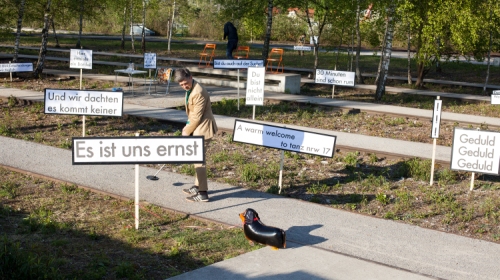 Bereits am Vorabend kann die Outdoor-Performance „(Not) under the bridge“ des Ensembles HARTMANNMUELLER auf dem Zechengelände angeschaut werden. Es regnet. Felix Ersing sucht mit einem Detektor das Gelände ab. Hartmann und Müller kommen in einem Kombi vorgefahren, aus dem laute Jazzmusik klingt. Simon Hartmann lädt beschriftete Schilder aus und rammt sie in den Boden, während Daniel Müller anfängt, mit dem Publikum zu flirten. Die Szenerie wird immer absurder. Müller beginnt, das Publikum im Kombi durch die Gegend zu fahren und Sekt an seine Gäste zu verteilen, während Hartmann unermüdlich am Schilderwald baut. Vor ihm ein kleiner Junge, der wissbegierig fragt: „Was steht da?“. Da steht beispielsweise „Schicht im Schacht“, „So sieht ein Weltkulturerbe aus“, „Hier entsteht ein Bordell“, „Der perfekte Ort“ oder „Wir dachten es kommt keiner“. Mitten in diesem Wald stehen vier orangene Stühle, dort wird Publikum platziert, mittlerweile mit bunten Sonnenbrillen und Sekt, aber immer noch im Regen, wie verirrte Urlauber*innen. Das ist unterhaltsam.