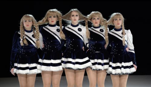 Irgendwann bekommt die Marschmusik dann einen Sprung in der Platte, der 4/4-Takt zerhackt, die Formation der Garde zerfließt. Die jungen Frauen mit ihren immer gleichen blonden Zöpfen in immer den gleichen Gardeuniformen, kurzen Röckchen und mit dem immer währenden stoischen Lächeln auf den roten Lippen vereinzeln sich wie die einstudierten Bewegungen, selbst das in-Reihen-Beine-werfen und der schnelle Spagat frieren ein oder werden zu Zeitlupenstudien: Hände gleiten nun langsam am Körper lang zur musikalischen Dauerschleife. Der Gardetanz ist dekonstruiert. Ausgerechnet hier ein eingespieltes Zitat: „The skirt is too short, the skirt is too long“. Wie immer liegt die Authentizität der Aussage im Geschlechterblick der jeweiligen Betrachter*innen.