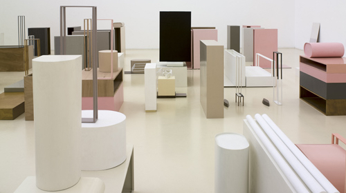 Die Einzelformen lassen an Gefäße und an Möbeldesign denken, auch an Architektur. Als weiche Ovale oder kantige Gestelle, gezimmert in Sperrholz, wirken sie „wie Vorschläge, wie Schatten oder Pläne für ein Objekt“, wie Nahum Tevet sagt. Und sind diese Elemente nicht auch als Malerei zu verstehen? Tevet berichtet, dass er von einem Maler ausgebildet worden sei zu einer Zeit, als in Israel die Sperrholzplatte als Bildträger eine Alternative zur Leinwand war. Viele seiner Objekte nun sind einheitlich und dicht in einem Farbton überzogen. Dieser ist licht, zugleich pastellartig. Ein angenehm künstliches Volumen liegt auch dann vor, wenn Gestänge einen leeren Raum umschreiben. Das Ensemble greift dabei die Proportionen des Ausstellungsraumes auf, wobei es Platz zum Vorbei- und Durchlaufen lässt und auf ein Raster hin aufgebaut ist. Aber Tevet geht spielerisch mit jeder Systematik um, schon indem er einzelne Elemente an die Wand lehnt und das Raumgebilde als übergeordnete Form versteht.