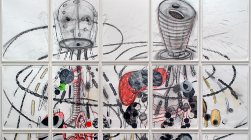 Diese Blätter wirken dadurch nicht nur malerisch, sondern besitzen auch Aspekte des Plastischen. Friedemann von Stockhausen, der 1945 geboren wurde und 1994-2012 eine Professur an der Kunsthochschule Braunschweig inne hatte, aber zunächst Ethnologie und Soziologie studiert hat, erfindet biomorphe Formulierungen, die den Bildraum durchqueren und sich bei den mehrteiligen Arbeiten über die Blattgrenzen hinweg fortsetzen. Stockhausen lotet die Möglichkeiten der Zeichnung mit Kohle und Gouache aus; Farbe setzt er sparsam, aber pronounciert. In der sehr konzentrierten Ausstellung im Museum Folkwang betrifft dies vor allem die 15-teilige Arbeit „Dimorph“, die jüngst vom Museum erworben wurde.