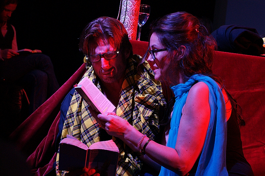 Schade, dass nur eine Handvoll Zuschauer das Wagnis einer 12-stündigen Lesung eingegangen sind. Obgleich das Konzept vorsah, dass ein jeder kommen und gehen konnte wie er wollte – was auch gut funktioniert, da die Eckpfeiler der Artus-Geschichte den meisten vertraut sein dürften und man schnell wieder ins Geschehen hineinfindet. Zudem gab es in den Pausen Essen und zu später Stunde auch Whiskey. Der konnte nach fast 12 Stunden (letztlich ging es dann doch schneller) zwar nicht alle Nerven beruhigen, aber darum geht es auch nicht. Sondern darum, dass hier ein mutiges Format wiederbelebt wurde (es gab ja einst die 24-Stunden-Lesung der Nibelungen zu Nobels Zeiten in der Rottstraße), dass sehr viel besser funktioniert, als man vielleicht vermuten würde: Auch ohne Probe gab es großarige Momente zwischen den Schauspielern (besonders zwischen Marc Zabinski als Lancelot und Britta Weilbacher als Königin Ginevra), eine Spontaneität, die die Marathon-Lesung in dieser Form einzigartig und nicht wiederholbar machen. Allein schon, weil man diese illustre Gruppe an Gästen wohl nur schwerlich wieder an einem Abend zusammen bringen wird, als da wären: Karin Moog, Maria Wolf, Thomas Anzenhofer, Peter Bond, Arne Nobel, Ron Kochanski, Dustin Semmelrogge, Marc Zabinski, Patrick Joswig, Peter Podewitz, Britta Weilbacher, Dirk Krogull, Heike Paplewski, Felix Lampert und Witek Danielczok. Bleibt zu hoffen, dass dieses Format, trotz der überschaubaren Resonanz, weiterleben wird.
