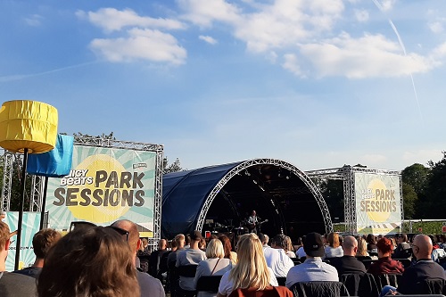 Tausende tanzende Menschen, frenetisch feiernde Fans, Wellenbrecher, Stroboskoplicht, Konfetti, Bands und Djs: So kennt man die große Festwiese im Westfalenpark, wenn das alljährliche Juicy-Beats-Festival seine musikalischen Früchte im Park verteilt. Dagegen wirkt der Aufbau für die Juicy-Beats-Park-Sessions wie für ein Kurkonzert: Großzügig verteilt bieten je paarweise miteinander verbundene Stühle Platz für 350 Zuschauer. Zwischen den Stuhlpaaren beträgt der Abstand nur mit viel gutem Willen und zwei zugedrückten Augen 1,50 m, aber durch Bierkästen wird der Abstand fest definiert und gleichzeitig das Problem der Flaschenrückgabe pragmatisch gelöst. An den Essens- und Getränkeständen herrscht bei Sonnenschein und angenehmen Temperaturen eine entspannte Atmosphäre ohne Drängeln in den locker aufgefädelten Schlangen. In den Toiletten gibt es fließendes Wasser, Seife und Desinfektionsmittel. Dass ein großes Wiesenareal in der Wartezeit nicht zum Sitzen oder Liegen genutzt werden darf, ist schade, aber verständlich in der aktuellen Situation, in der Veranstalter stets die Gefahr eines Verbotes vor Augen haben müssen. Schließlich gab es erst vor ein paar Tagen große Diskussionen um Polonaisen beim Konzert der Kapelle Petra in Hamm, wo die Reihe „Livesommer“ mit einem ähnlichen Konzept auf die Beine gestellt wurde wie die Park-Sessions.