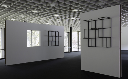 Im Wechselausstellungsraum des Josef Albers Museum in Bottrop sind diesmal keine Gemälde und keine Fotografien zu sehen. Stattdessen befinden sich hier, verteilt im Raum, nüchtern weiße Stellwände, an denen vereinzelt Rasterfolgen aus Eisen oder Holz – skulpturale Wandstücke – hängen. Aus einer der mauerartigen Flächen ist ein rechteckiges Feld herausgeschnitten. Durch diese Öffnung schaut man auf die zweigeschossige Fensterfront und damit nach draußen, in den Stadtgarten. Eine weitere Besonderheit der Stellwände ist, dass ihre Seiten nicht verkleidet sind. Die technische Konstruktion tritt offen zutage und betont noch, dass die Wände funktionale Architektur sind. Sie strukturieren den Saal, sind auf diesen hin angefertigt und tragen dort die Skulpturen. Zugleich sind sie als Module der Installation Teil der Ausstellung von Hubert Kiecol. Das ist sowieso eines seiner Anliegen: Mit seinen Werken reagiert er auf die vorgegebene Situation. Wie er im Gespräch berichtet, interessieren ihn seit einiger Zeit vor allem landschaftliche Gegebenheiten als Orte für seine Skulpturen.