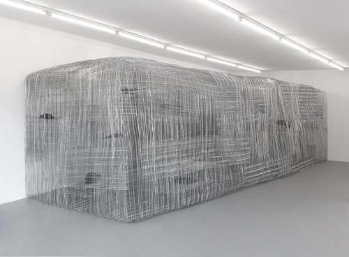 Was normalerweise unsichtbar unter Putz verborgen ist, offenbart hier nun als filigraner Metallkokon seine ästhetischen Qualitäten: im Licht der Leuchtstoffröhren glitzernd verflochtene Gitter, die im Vorbeigehen eine Art Moiré-Effekt erzeugen. Rentmeister spielt mit seinem Material und erzeugt Kontraste zur gewohnten Nutzung. Aus flach ausgewalzten Gitterplatten, die im Alltag auf dem Bau stabilisierend dazu beitragen, dass heikle Wandflächen verputzt werden können, baut er einen buckeligen Riesenquader, eine rundum geschlossene Form mit vielseitigen Einblicken in ein mehrfach verschachteltes Innenleben.