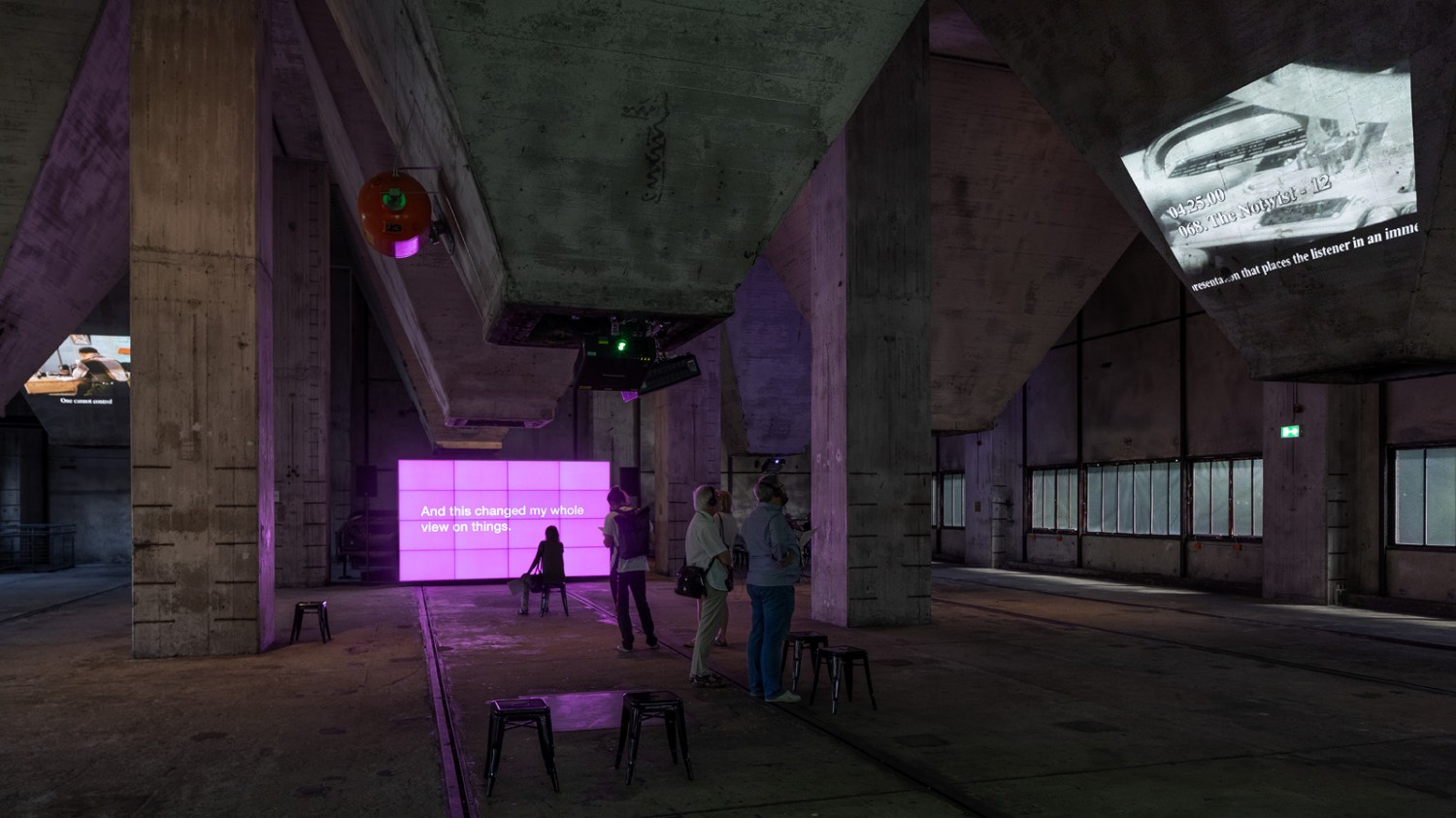 Das Ergebnis ist eine Multimedia-Installation aus elf Diashow-Projektionen, zu der man Musik hört. Die Besucher*innen erhalten direkt am Empfang einen Player plus Kopfhörer. Ohne diese Technik funktioniert die Ausstellung nicht, so der Hinweis. Mit den Kopfhörern funktioniert es allerdings auch nicht immer. Manchmal ertönt die Musik. Dann verschwindet sie wieder. Die Projektionen laufen weiter.