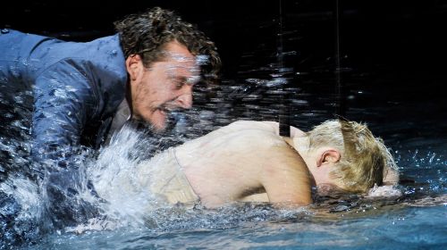 Die Hochzeit ist nicht ihr Happy End, sondern ihre Verurteilung zu einem Leben in einem viel zu engen Geschlechter- oder vielmehr Identitätskorsett. Als sie völlig zusammenbricht, erscheint ein ihr zwillingsgleicher junger Mann, der sie mit einem Feuerwehrschlauch unter Wasserbeschuss nimmt, von links tut es ihm eine intakte Brautversion der Verzweifelten gleich. Ein eindrucksvolles Bild für den Zusammenbruch. Die Eigen- und Fremderwartungen an ihre Rolle als Frau spülen sie buchstäblich hinweg. Der Lichterhimmel lüftet sich, die Braut wird vom Wasser in die Anderswelt „Illyrien“ gespült, und erst hier beginnt die eigentliche Shakespearehandlung. Der Schiffbruch als Nervenzusammenbruch, das ist nichts für Shakespearepuristen, für alle anderen aber sehr sehenswert. Jana Schulz meistert ihre Rollen als Viola, Sebastian und Cesario mit vollem Körpereinsatz und einem feinen Gefühl für Zwischentöne auf einer Bühne, die Claudia Rohner in ein düsteres Alptraumland verwandelt hat. Das Komische kommt trotzdem nicht zu kurz, denn Vontobel lässt die Nebenfiguren ausführlich zu Wort kommen und kostet den derben Humor voll aus.